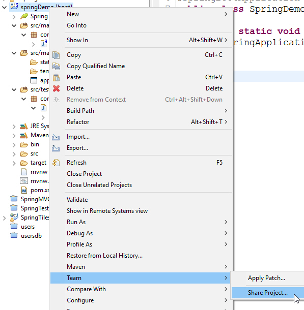 3. Right click project => Team => Share Project => Finish